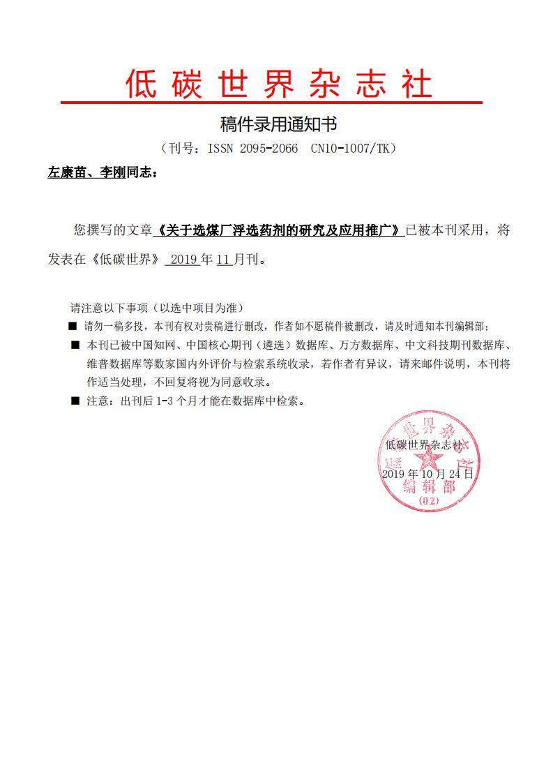 山东巨野友邦实业有限公司《关于选煤厂浮选药剂的研究及应用推广》经《低碳世界》杂志社录用通知