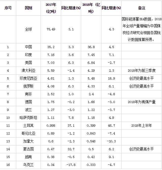 2018年世界主要煤炭生产国产量变化情况