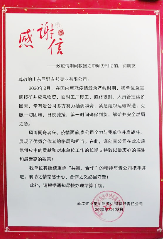 致疫情期间救援之中倾力相助的厂商朋友 —— 山东巨野友邦实业有限公司